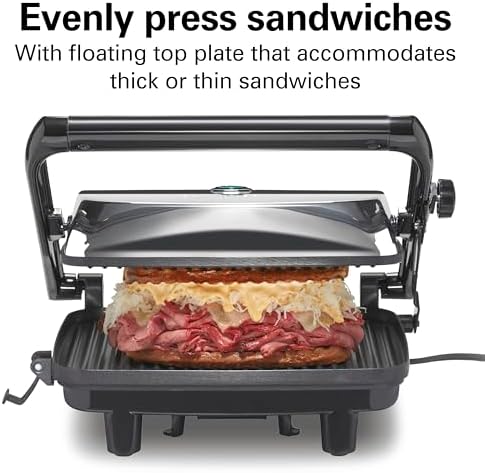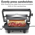 FLOATING LID: This hot sandwich maker features a café-style floating lid that evenly presses any size sandwich.