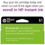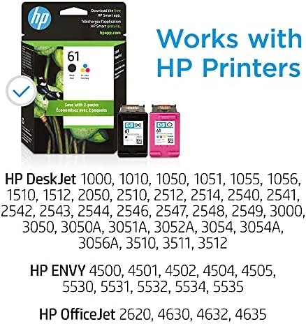 What’s in the box: 1 New Original HP 61 pack of 2 ink cartridges (CR259FN): 61 black ink cartridge (CH561WN), 61 tri-color ink cartridge (CH562WN)
