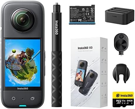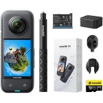 Includes 1x Insta360 X3, 1x 70cm Invisible Selfie Stick, 1x Motorcycle Mount Bundle, 1x 64GB microSD Card and 1x Lens Cap.