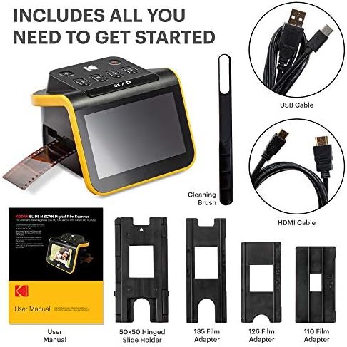 CONVENIENT EASY-LOAD FILM INSERTS: Quick-Feeding Tray Technology Allows for Continuous Loading Action, Making Scanning Fast and Simple Includes 50mm Slide Holder, Adapters for 135, 110 and 126 Films, Cleaning Brush, USB and HDMI Cables