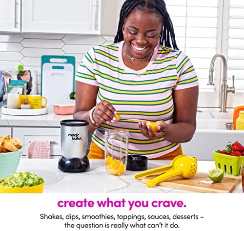 Magic Bullet 11-Piece Set Blender & Food Processor for Kitchen with Over 40 million Bullets sold! Make it fast by keeping it simple. Does any job in 10 seconds or Less! Hi-speed blender & mixer. 10 second recipe book included. Like your personal kitchen food processor & blender assistant. Do it all with hi-speed blender & mixer system. Chop, Mix, Blend, Whip, Grind, and Mince. Handy versatile and easy to use, the Magic Bullet Blender & Food Processor takes up minimal counter space while showcasing maximum speed and versatility. With its unique design and compact size, the Magic Bullet Blender & Food Processor chops, mixes, blends, whips, grinds and more in less time than it takes to assemble standard kitchen appliances. Make the perfect smoothies and milkshakes, frozen cocktails, and pureed soups super easily! And with a wide array of dishwasher-safe attachments, clean-up is as easy as it gets. The secret to the Magic Bullet’s time-saving efficiency is its specially designed blade and unique bullet shape. These features work together too quickly and forcefully circulate food back into the Cyclonic Cutting Zone, allowing the Magic Bullet to do virtually any food prep task in seconds.