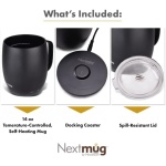 WHAT’S INCLUDED – (1) 14 oz Nextmug; (2) Docking Coaster & 6-foot cord to charge the lithium-ion battery inside the Nextmug; (3) Spill-Resistant Lid to keep hot liquids in the mug and help maintain the ideal temperature for longer periods of time.