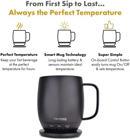 ALWAYS THE PERFECT TEMPERATURE – The Nextmug will keep your hot coffee, tea or preferred beverage at the perfect temperature wherever you are. Simply select Warm (130°), Hot (140°), or Piping (150°) and enjoy for hours.