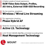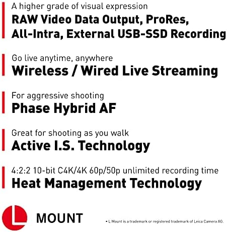 Expressive Video Functionality: 14+ stop V-Log/V-Gamut capture delivers a high dynamic range and broad colors; in-camera photo and video color grading; 5.8K Pro-Res, Pro-Res internal, RAW over HDMI, Wireless/Wired IP streaming