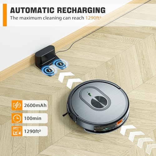 ✅【100min Runtime & Automatic Charging】 The HR101 robot vacuum cleaner has a built-in 2600mAh lithium battery, 100 minutes in quiet mode, 80 minutes in standard mode and 60 minutes in maximum mode, and the maximum cleaning area can reach 1290ft². Suitable for a variety of home types. When the battery is low less 15% or cleaning is complete, robot vacuum cleaner will automatically return to the charging dock to charge.
